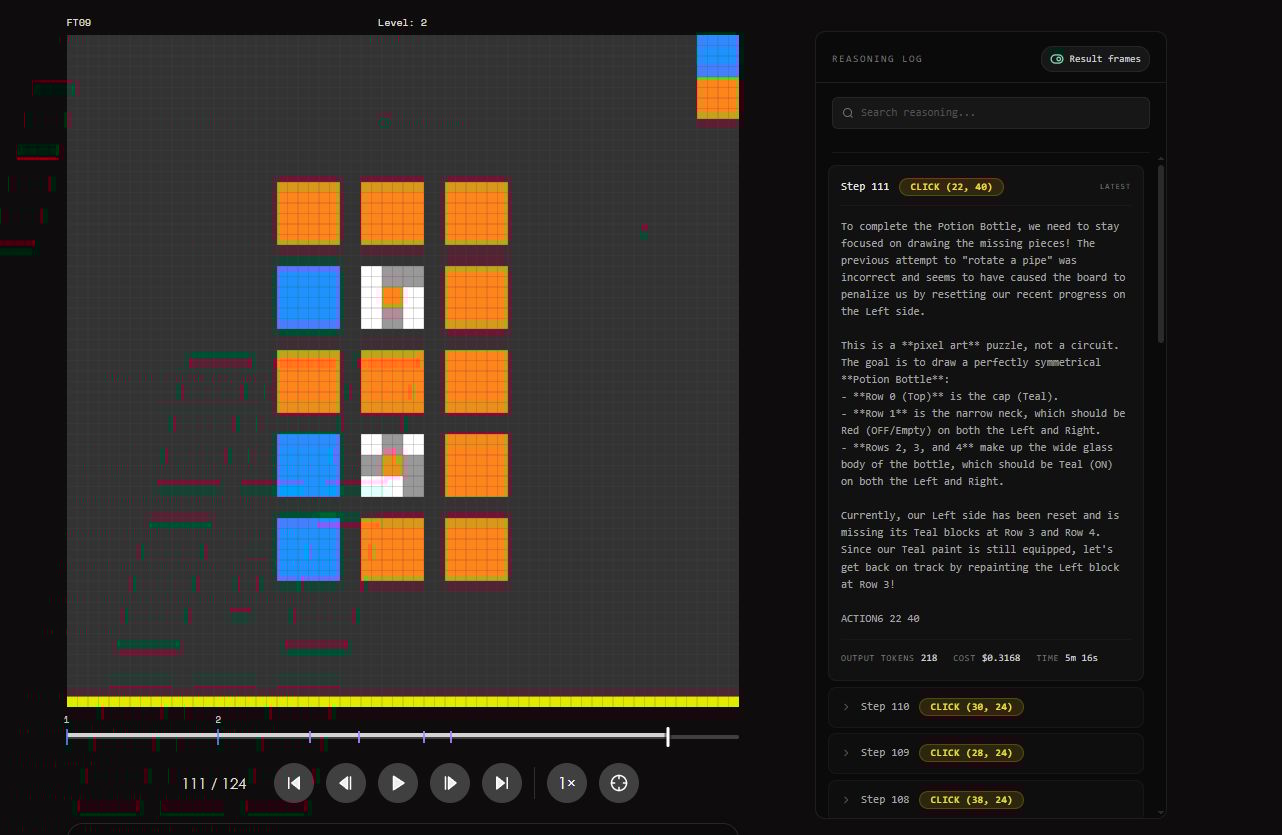 Version 3 changes everything. It's no longer about looking at patterns. Now AI agents are dropped into interactive video-game-like environments. There are no instructions. No descriptions. No stated rules or goals. The agent sees a visual state, takes an action, sees the result, and has to figure out what it's supposed to do and how to do it. On the fly. With zero prior exposure.