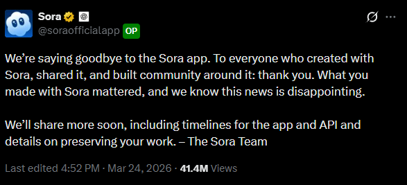 OpenAI killed Sora. The AI video generation platform that broke the internet when it launched is officially gone. OpenAI's goodbye was brief: "We're saying goodbye to the Sora app." No detailed explanation. No pivot announcement. Just done. Meanwhile Sam Altman announced the OpenAI Foundation with $1 billion in initial funding aimed at tackling AI threats and accelerating scientific discovery. One product dies, a billion dollar foundation is born. OpenAI is clearly reshuffling what matters to them heading into the second half of 2026.