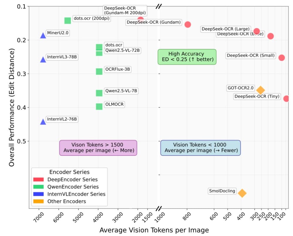 The chart shows DeepSeek-OCR (red dots) outperforming every other encoder in accuracy vs. token efficiency — meaning it’s both smarter and lighter than traditional OCR models.
