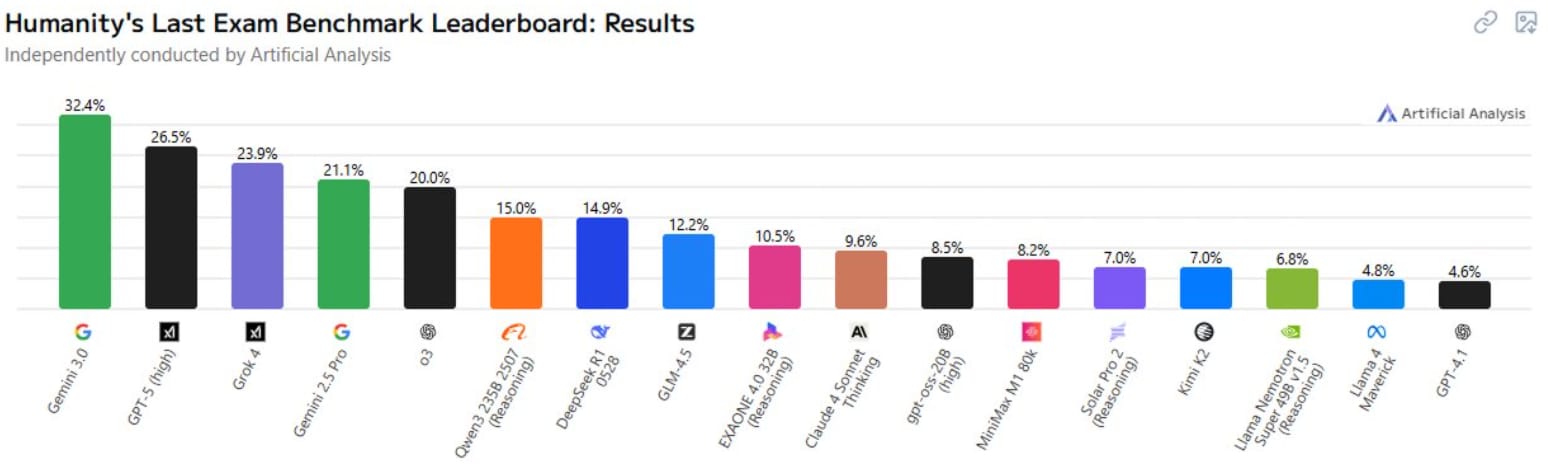 Leaked benchmark results showing Gemini 3.0 leading at 32.4%, ahead of GPT-4o (26.5%) and other current AI models on the 'Humanity's Last Exam' evaluation.