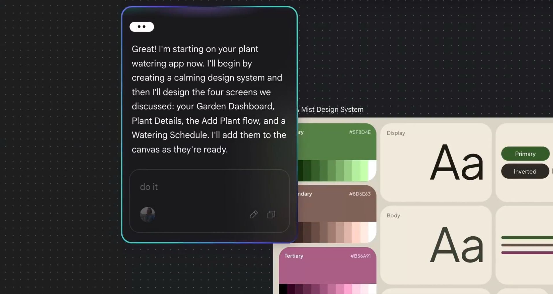 Here's what's new. An infinite canvas where you can drop in images, text, and code as context. A design agent that reasons across your entire project and works on multiple ideas at the same time. Voice mode where you talk to your canvas and it makes changes in real time. Say "give me three different menu options" or "show me this in different color palettes" and it just does it while you're talking.