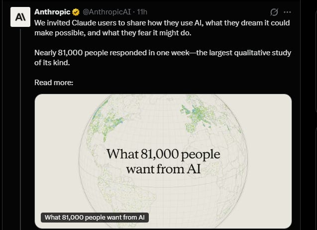 Anthropic published the largest qualitative AI study ever. 81,000 Claude users across 159 countries and 70 languages shared how they use AI, what they hope for, and what scares them.