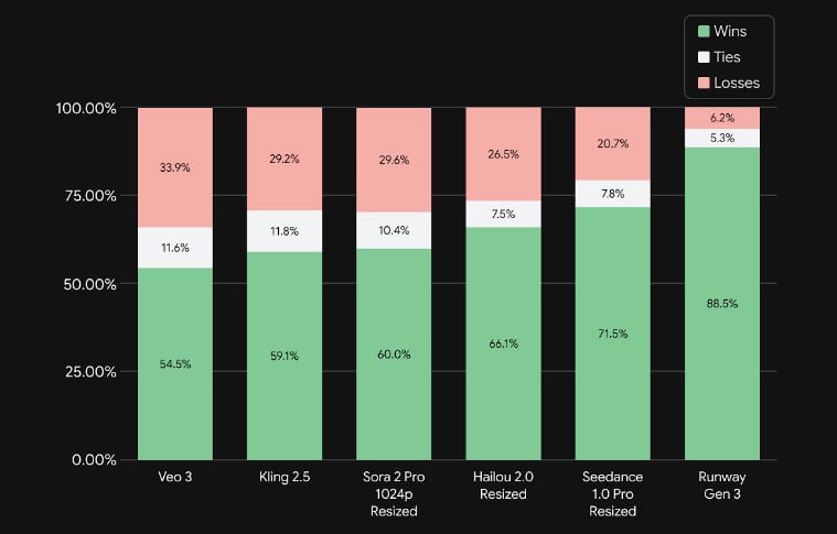 Veo 3 performance vs competitors — wins 54.5% of the time in blind comparisons, beating Kling, Sora, and Hailou.