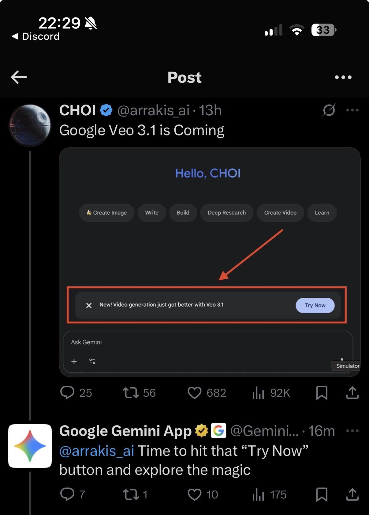 Veo 3.1 quietly rolled out in Gemini Advanced — users spotted the update via this hidden “Try Now” banner and Google’s reply.